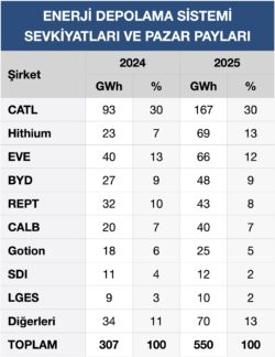 Batarya üreticilerinin Lityum İyon tabanlı Enerji Depolama Sistemi (EDS) sevkiyatlarının 2025 yılında önemli miktarda artış gösterdiği ve Çinli firmaların pazar paylarının arttığı bildirildi.