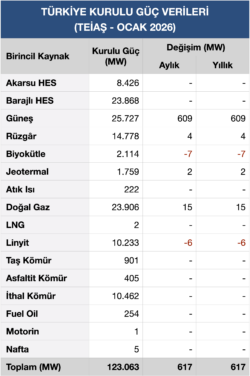 Ocak ayında rüzgâr enerjisi gücü 4 MW’lık bir lisanssız projenin devreye girmesi ile 14.778 MW’a, jeotermal enerji gücü de 2 MW’lık artış ile 1.759 MW’a yükseldi.