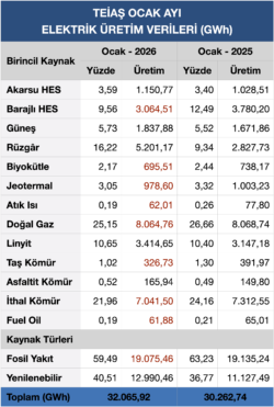 Türkiye’nin ocak ayı elektrik üretimi, 2025 yılının ocak ayına göre %5,9 oranında artış ile 32.065,92 Gigavat-saat (GWh) olarak gerçekleşti.